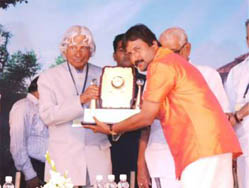 DR A P J ABDUL KALAM PRESENTING A MOMENTO TO JAYAN BILATHIKULAM FOR DESIGNING THE vaidyarathnam ayurvedic MUSEUM BUILDING.